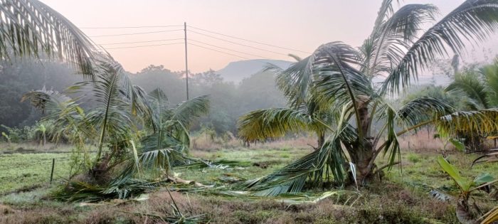 दरम्यान, काल पुन्हा मध्यरात्री हेवाळे खराडी भागात शेती बागायतीची मोठी हानी केली. त्याच बरोबर शेती बागायतीची नुकसानी करत असताना शनिवारी रात्री हेवाळे येथील एका शेतकऱ्याचा नारळाचे झाड उन्मळून गुरांच्या गोठ्यावर पडला. या गोठयात एकूण आठ गुरे बांधली गेली होती. यातील सर्व गुरे गंभीरपणे जखमी झाली आहेत. तर यातील एक बैल गोठ्यातून बाहेर गेला तो आज पर्यंत गोठयात आला नव्हता. यासह ,माड,केळी, सुपारी यांची केलेली नासधूस यामुळे मोठे नुकसान झाले आहे.