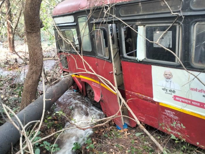 मिळालेल्या माहितीनुसार, धाराशिव जिल्ह्यातील जय हिंद विद्यालय, कसबे तडोळे या शाळेची सहल शुक्रवारी धाराशिव आगाराच्या एसटी बसने देवगडमध्ये आली होती. दुपारी मिठमुंबरी येथे जेवण करून सहल खाकशी मार्गे कुणकेश्वरकडे जाण्यासाठी रवाना झाली. मात्र, खाकशी शाळेनजीक असलेल्या धोकादायक वळणावर चालक विभीषण गायकवाड यांचा एसटीवरील ताबा सुटल्याने गाडी डाव्या बाजूला पाच फूट खाली गेली. सुदैवाने झाडेझुडपे, आंब्याची बाग आणि देवगड नळ योजनेची पाईपलाईन असल्याने एसटी थांबली.