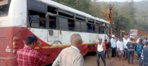 मंडणगड l प्रतिनिधी : सोमवार दि. 13 जानेवारी 2025 रोजी रात्रौ 1.55 वाजण्याच्या सुमारास राष्ट्रिय महामार्ग क्रं.965 डी,वर मंडणगड ते म्हाप्रळ दरम्याने शेनाळे घाटामध्ये चिंचाळी धरणा जवळ दाभोळ मुंबई एस.टी. बस रस्ता सोडून 15 फुट खाली घसरून पलटी होवून अपघात झाला. सुदैवाने यामध्ये कोणत्याही प्रवाशांना गंभीर दुखापत झाली नाही. यावेळी गाडीमध्ये 41 प्रवासी प्रवास करत होते. गाडी क्र. एम.एच.14.बि.टी. 2265 हि दापोली आगाराची गाडी दापोलीहून मुंबईकडे प्रवास करत होती. गाडीचे चालक व्हि.एस. गावडे व वाहक मंदार भोईर हे होते. मंडणगड हनू गाडी मुंबईकडे रवाना झाली असताना शेनाळे घाटात चिंचाळी धरणा नजीक गाडी रस्ता सोडून सूमारे 15 फुट बाजुला पलटी झाली. यावेळी समोर असलेल्या झाडाला एस.टी अडकल्याने गाडीतील सुमारे 41 जणांचे प्राण वाचले. गाडी झाडाला अडकली नसती तर ती खोल दरीतील धरणामध्ये थेट कोसळली असती. अपघातामध्ये दापोली तालुक्यातील सर्व प्रवासी होते. अपघातावेळी या मार्गावर प्रवास करणारे रायगड जिल्हयातील खालापूर तालुक्यातील चैक येथील मनोज थोरवे व त्यांचे सहकारी मदतीसाठी थांबलेे या दरम्याने मंडणगड येथील सचिन चव्हाण व गोठे गावातील जितेंद्र दवंडे हे कोस्तुभ भिंगार्डे यांच्या श्री रूग्ण वाहिकेने अन्य रूग्णाला घेवून मुंबईला जात होते. चव्हाण यांनी एस.टी. बस पलटी झालेली पाहून स्थितीचे गांभीर्य लक्षात घेत गाडीत प्रवेश करून बचाव कार्यास सुरूवात केली. त्यांनी गाडीतील प्रवाशांना बाहेर काढण्यास सुरूवात केली. त्याबरोबर गाडीतील काही तरुण प्रवासी तसेच जितेंद्र दवंडे, मनेाज थोरवे, व त्यांचे सहकारी, त्याच बरोबर नगरसेवक मुश्ताक दाभीळकर यांनी सहकार्य केले. अपघाताची माहिती मिळताच मंडणगड पोलीस स्थानकाचे पोलीस निरीक्षक नितीन गवारे यांच्या मार्गदर्शनाखाली पोलीस उपनिरीक्षक संजय धुपकर, पोलीस हवालदार गणेष चव्हाण, पोलीस काॅन्स्टेबल सुहास मांडवकर, विशाल कोळथरकर, महेंद्र तांदळे, आकाराम माने यांनी मदत कार्यात सहभाग घेतला. जखमी प्रवाशांना मंडणगड ग्रामिण रूग्णालयाच्या रूग्ण वाहिकेने मंडणगड ग्रामिण रूग्णालयात आणून प्राथमिक उपचार करून घरी सोडण्यात आले आहे.