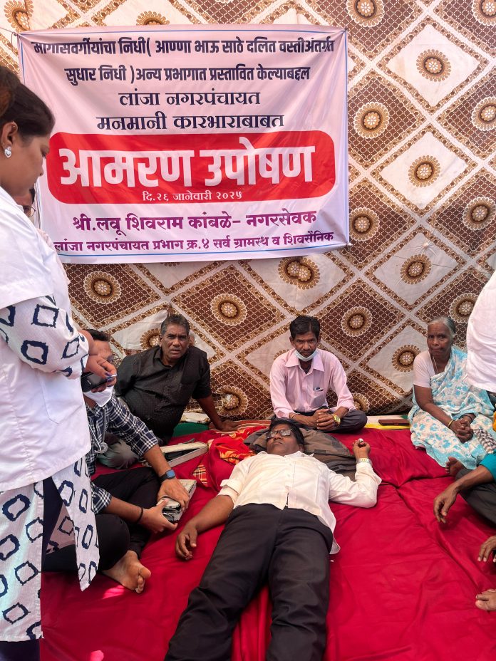 अण्णाभाऊ साठे दलित वस्ती अंतर्गत मागासवर्गीयांसाठीv असलेला आपल्या प्रभाग क्रमांक ४ मधील निधी अन्य प्रभागात वळविण्याच्या निषेधार्थ लांजा नगरपंचायतीचे नगरसेवक लहू कांबळे यांनी प्रजासत्ताक दिनी लांजा तहसील कार्यालयासमोर आमरण उपोषण छेडले आहे. आज सोमवारी दुसऱ्या दिवशी सकाळपासून नगरसेवक लहू कांबळे यांची प्रकृती खालावली आहे.