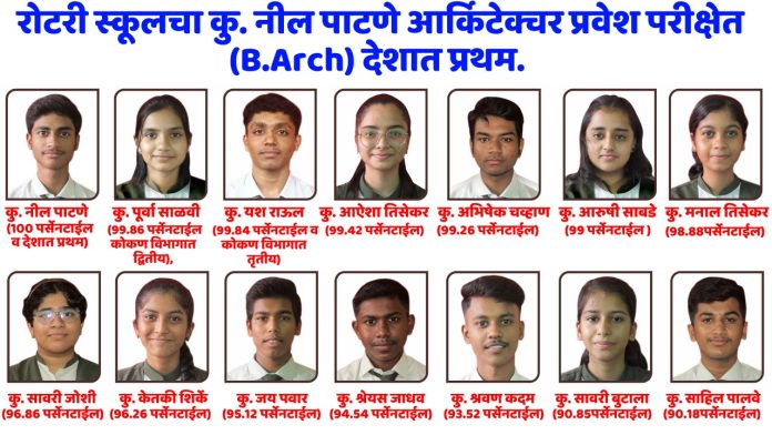 B. Arch या प्रवेश परीक्षेच्या माध्यमातून बॅचलर ऑफ आर्किटेक्चर कोर्सेसकरिता दरवर्षी संपूर्ण देशभरातून विद्यार्थी प्रविष्ठ होत असतात. या परीक्षेत दरवर्षीप्रमाणे यंदाही रोटरी स्कूलचे विद्यार्थी देशभरातील हजारो विद्यार्थ्यांमधून उज्ज्वल यश संपादित केलेल्या विद्यार्थ्यांमध्ये आपले स्थान निश्चित करून भारतातील नामांकित महाविद्यालयातील प्रवेशास पात्र ठरले आहेत.