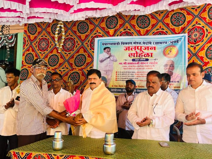 संगमेश्वर तालुक्यातील पेढांबे पंचरत्नवाडी येथील पाण्याची समस्या पाहता राष्ट्रवादी काँग्रेस पक्ष शरदचंद्र पवार पक्षाचे प्रदेशसरचिटणीस तथा वाशिष्ठी डेअरचे चेअरमन प्रशांत यादव यांनी येथे पाण्याची साठवण टाकी देण्याचे वचन दिले होते.दिलेल्या वचनाची वचनपूर्ती केल्यानंतर साठवण टाकीचे उदघाटन व जलपूजन प्रशांत यादव यांच्या हस्ते पार पडले.यावेळी पंचरत्नवाडी विकास मंडळ, पेढांबे. ता संगमेश्वर ( ग्रामस्थ / मुंबई ) मंडळ यांच्या वतीने प्रशांत यादव यांचा यथोचित सन्मान करण्यात आला.तसेच आम्ही नेहमीच प्रशांत यादव यांच्या पाठीशी ठाम उभे राहू असा शब्द ग्रामस्थांनी यावेळी दिला.