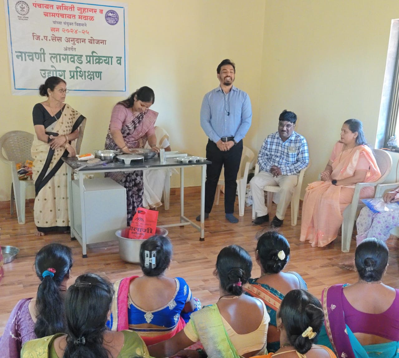 प्रशिक्षणात नाचणी लागवड, प्रक्रिया व उद्योग याविषयावर तसेच व्यावसायिक दृष्ट्या नाचणीपासून बनणारे पदार्थ व त्यावर आधारित लघुउद्योगाच्या संधी यावर शरदचंद्रजी पवार अन्नतंत्रद्यान महाविद्यालय खरवते-दहिवली येथील प्राध्यापक सौ. विचारे मॅडम यांनी शेतकऱ्यांना व बचतगटांना मार्गदर्शन केले.