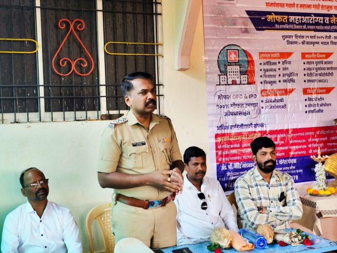 जिजाऊ शैक्षणिक व सामाजिक संस्था महाराष्ट्र श्री भगवान महादेव सांबरे रुग्णालय झडपोली यांच्या संयुक्त विद्यमाने मोफत महाआरोग्य व नेत्र तपासणी शिबिर 21 मार्च रोजी गवाणे येथे पार पडले. याप्रसंगी प्रमुख पाहुणे म्हणून पोलीस निरीक्षक निळकंठ बगळे हे बोलत होते. याप्रसंगी व्यासपीठावर गवाणे गावचे सरपंच भिमराज कांबळे, जिजाऊ शैक्षणिक व सामाजिक संस्था महाराष्ट्र लांजा तालुकाप्रमुख योगेश संतोष पांचाळ,गवाणे गावचे पोलीस पाटील रवींद्र कोटकर व अवधूत रामाणे, तंटामुक्ती अध्यक्ष गोविंद करंबेळे, संतोष रेवाळे सामाजिक कार्यकर्ते, राकेश कदम, नितीन घुमे आदी उपस्थित होते.