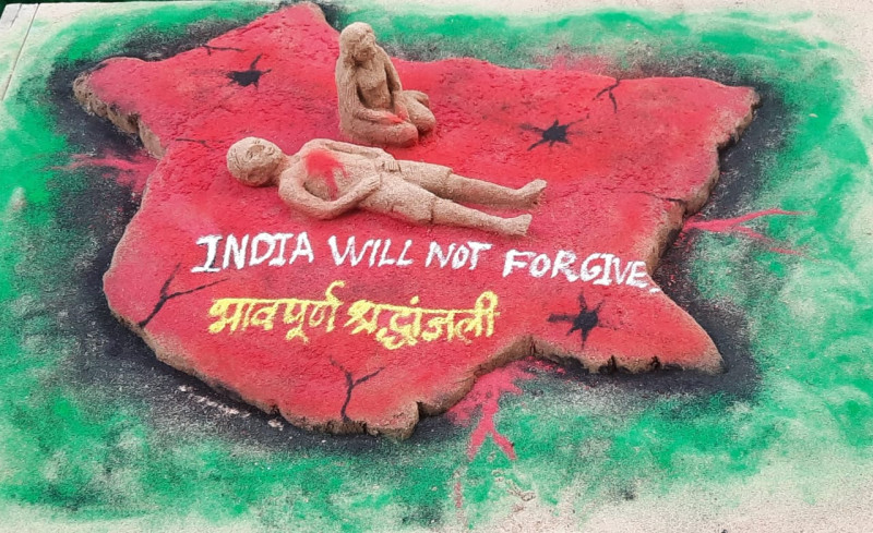 वेंगुर्ले l दाजी नाईक :पहलगाम (जम्मू काश्मीर) येथे मृत्युमुखी पडलेल्या निष्पाप नागरिकांना आरवली सोन्सुरे येथील वाळू शिल्पकार रविराज चिपकर यांनी आपल्या वाळू शिल्पकलेतून श्रद्धांजली वाहिली आहे.