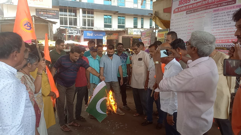 कणकवली :पहलगाम येथे हिंदू पर्यटकांवर पाक पुरस्कृत अतिरेक्यांनी हल्ला केला. यात २६ निष्पाप पर्यटकांचा बळी गेला. शुक्रवारी येथील पटवर्धन चौकात सकल हिंदू समाजाच्या वतीने या हल्ल्याचा निषेध करताना पाकिस्तानचा ध्वज तुडवून जाळण्यात आला. तसेच पाकिस्तानविरोधी घोषणाही उपस्थित देशप्रेमी कार्यकर्ते आणि नागरिकांनी दिल्या.