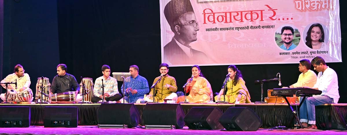 रत्नागिरी : महाराष्ट्र शासनाचे पर्यटन संचालनालय, विवेक व्यासपीठ, पतितपावन मंदिर संस्था आणि श्री भागोजीशेठ कीर ट्रस्ट यांच्या संयुक्त विद्यमाने स्वा. सावरकर यांच्या १४० व्या जयंतीनिमित्त आठवडाभर सावरकरांना विविध कार्यक्रमांतून अभिवादन केले. त्यात आघाडीचा गायक प्रथमेश लघाटे व आघाडीची गायिका मुग्धा वैशंपायन यांनी सादर केलेला विनायका रे या संगीत कार्यक्रमाने कळस चढवला. नाट्यगृहात ८०० रसिक प्रेक्षकांच्या उपस्थितीत हा कार्यक्रम उत्तरोत्तर रंगत गेला.
