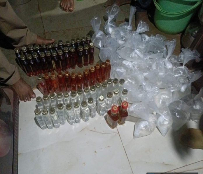लेमन होडका लेबल असलेल्या १८० मिली मापाच्या २६ प्लास्टिक बाटल्या तसेच ६९० रुपये किमतीच्या हनी ब्लेंड प्युअर लेबर असलेल्या १८० मिली मापाच्या २३ प्लास्टिकच्या बाटल्या ३०० रुपये किमतीच्या हायवर्ड फाईन व्हिस्की लेबल असलेल्या १८० मिली मापाच्या १० प्लास्टिकच्या बाटल्या हे विदेशी मध्य त्याचप्रमाणे ७५० रुपये किंमतीची गावठी हातभट्टीची दारू असा एकूण २५२० रुपयांचा मुद्देमाल पोलिसांनी जप्त केला आहे .