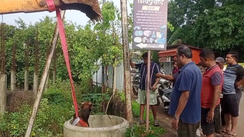 कणकवली : शहरात डीपी रोड नजीक असलेल्या गटाराच्या चेंबरमध्ये आज सकाळी ६:३० वाजण्याच्या सुमारास बैल पडल्याची घटना घडली. ही घटना समजतात माजी उपनगराध्यक्ष बंडू हर्णे यांच्या ही बाब तेथील काहींनी निदर्शनास आणली. त्यानंतर माजी उपनगराध्यक्ष बंडू हर्णे यांनी तातडीने घटनास्थळी पाहणी करत ठेकेदार अनिल पवार यांच्या कर्मचाऱ्यांच्या व सामाजिक कार्यकर्त्यांच्या माध्यमातून या बैलाला जीवदान दिले. डीपी रोड जवळील एका गटाराच्या चेंबरमध्ये सकाळच्या सुमारास हा बैल पडल्यानंतर येथील काही स्थानिकानी ही घटना पाहिली. त्यानंतर माजी उपनगराध्यक्ष श्री हर्णे यांच्यासहित स्थानिक लोकही या ठिकाणी जमा झाले. मात्र बैल ज्या चेंबर मध्ये पडला होता तिथून तो गटारातून त्या पुढील चेंबर मध्ये जाऊन थांबला. सुदैवाने बैलाला मोठी दुखापत झाली नाही. दरम्यान बैलाला बाहेर काढण्यासाठी जेसीबी द्वारे बेल्ट लावून चेंबरमध्ये कर्मचारी उतरून त्या बैलाला सुखरूप बाहेर काढले. यावेळी अनिल पवार, मिथुन ठाणेकर नागवे ग्रामपंचायत सदस्य संदेश उर्फ मन्या सावंत यांच्यासह अन्य उपस्थित होते.