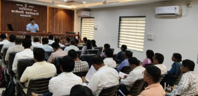 कणकवली तहसीलदार कार्यालयामध्ये पूरप्रवण क्षेत्र व दरड प्रवण क्षेत्रातील गावातील सरपंच, ग्रामसेवक व तलाठी यांना मार्गदर्शन करताना श्री देशपांडे बोलत होते.