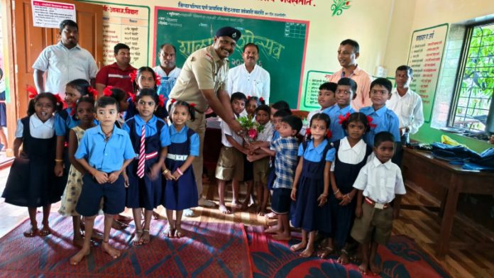 खंडाळा l वार्ताहर र् आज 16 जून शाळेचा पहिला दिवस वरून राजा लहान मुलांच्या स्वागताला हजर होता. शाळेतील मुलांची छत्री नवीन,गणवेश नवीन, दप्तर नवीन,चप्पल नवीन यातच स्वागताला सागरी पोलीस ठाणे जयगड ठाण्याचे सहाय्यक पोलीस निरीक्षक श्री कुलदीप पाटील साहेब, या पहिल्या दिवशी जिल्हा परिषद पूर्ण प्राथमिक आदर्श शाळा जांभारी नंबर एक ला भेट दिली या भेटीनिमित्त नवीन मुलांचे स्वागत श्री पाटील साहेब यांनी केले. यावेळी पाटील साहेब म्हणाले की मराठी माध्यम मध्ये शिकलेली मुले आज मोठ्या मोठ्या पदावर कार्यरत आहेत शिक्षण हे प्रगतीचे प्रतीक आहे गुरुजी च्या शिकवणीमुळे संस्काराची शिदोरी या वयात मुले आत्मसात करतात. आपण कितीही मोठे झालो तरी आई वडील गुरुजी यांचे ऋण आपण कधीही फेडू शकत नाही. यावेळी शाळेतील मुलांना पाठ्यपुस्तक गणवेश वाटप करण्यात आला. या वेळी हेड कॉ. शिंदे,जांभारीचे सरपंच आदेश वासावे, पालक वर्ग व शिक्षक वर्ग उपस्थित होते