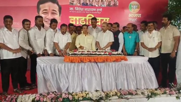 कणकवली : राज्याचे मस्त्यव्यवसाय व बंदरे विकास मंत्री तथा सिंधुदुर्ग जिल्ह्याचे पालकमंत्री ना. नितेश राणे यांचा कणकवली येथील ओम गणेश निवासस्थानी मोठ्या उत्साहात केक कापून वाढदिवस साजरा करण्यात आला. यावेळी मस्त्यव्यवसाय व बंदरे विकास मंत्री तथा सिंधुदुर्ग जिल्ह्याचे पालकमंत्री ना. नितेश राणे यांना उपस्थितांनी शुभेच्छा दिल्या. यावेळी भाजपचे जिल्हाध्यक्ष प्रभाकर सावंत, शिवसेना जिल्हाप्रमुख दत्ता सामंत, माजी जिल्हा परिषद अध्यक्ष संदेश सावंत, जिल्हा बँक अध्यक्ष मनीष दळवी, माजी नगराध्यक्ष समीर नलावडे, राष्ट्रवादी जिल्हाध्यक्ष अबिद नाईक, युवामोर्चा जिल्हाध्यक्ष संदीप मेस्त्री, तालुकाध्यक्ष मिलिंद मेस्त्री, अशोक राणे, शहराध्यक्ष अण्णा कोदे, प्रकाश सावंत, विठ्ठल देसाई, रणजित देसाई, संतोष कानडे यांच्यासह पदाधिकारी व कार्यकर्ते मोठ्या संख्येने उपस्थित होते.
