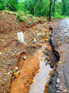 केवळ संरक्षण भिंत नसल्यामुळे आंबव पोंक्षे ते आरवली दरम्यान रस्ता पहिल्याच पावसात खचला आहे. अनेक ठिकाणी गटार काढले नसल्यामुळे रस्ता ची साईड पट्टी वाहून मोठ मोठ्या चरी पडल्या आहेत. त्यामुळे डांबरी करणावरून गाडी जरा बाहेर गेली तर पलटी झालीच समजा असा संभाव्य धोका निर्माण झाला आहे.