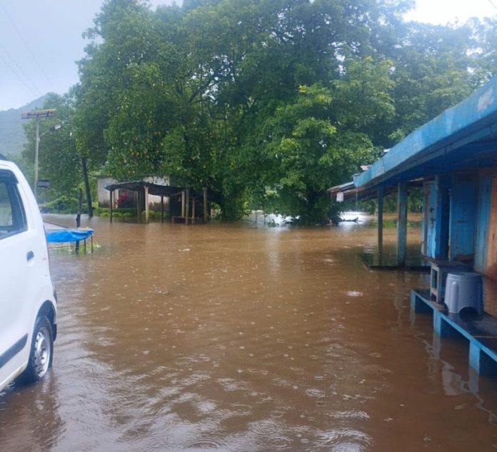 गौरव पोंक्षे l माखजन : १४ रोजी रात्री पासून पडणाऱ्या संततधार पावसाचा फटका संगमेश्वर तालुक्यातील माखजन बाजारपेठेला बसला आहे.गडनदीच्या पूराचे पाणी थेट माखजन बाजारपेठेत घुसल्याने व्यापाऱ्यांची पळापळ झाली.गेले आठ दिवस उसंत घेऊन पडणाऱ्या पावसाने अचानक रौद्र रूप धारण केले.यामध्ये मालाची हलवाहलव करे पर्यंत,काही माल पाण्यात भिजल्याने व्यापाऱ्यांचे नुकसान झाले आहे.