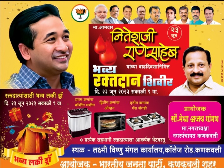 कणकवली (प्रतिनिधी) : आमदार नितेश राणे यांच्या वाढदिवसानिमित्त कणकवली शहर भाजपाच्या वतीने भव्य रक्तदान शिबिर आयोजित करण्यात आले असून रक्तदात्यांसाठी खास लकी ड्रॉ द्वारे बक्षिसे दिली जाणार आहेत. तसेच प्रत्येक रक्तदात्याला आकर्षक भेटवस्तू देण्यात येणार आहे. लक्ष्मी विष्णू हॉलमध्ये 23 जून रोजी सकाळी 9 वाजता रक्तदान शिबिराला सुरुवात होणार आहे. माजी नगराध्यक्ष समीर नलावडें च्या संकल्पनेतून रक्तदात्यांसाठी लकी ड्रॉ असणारे हे आगळेवेगळे रक्तदान शिबिर आयोजित करण्यात आले आहे. माजी नगराध्यक्षा मेघा गांगण यासाठी प्रायोजक असून लकी ड्रॉ प्रथम विजेत्या रक्तदात्याला वॉशिंग मशीन, द्वितीय विजेत्याला ओव्हन, तृतीय विजेत्याला गॅस शेगडी भेट देण्यात येणार आहे. तसेच प्रत्येक सहभागी रक्तदात्याला आकर्षक भेटवस्तू देण्यात येणार आहे. या रक्तदान शिबिरात जास्तीत जास्त रक्तदात्यांनी सहभागी व्हावे असे आवाहन भाजपा कणकवली शहर प्रमुख अण्णा कोदे यांनी केले आहे.
