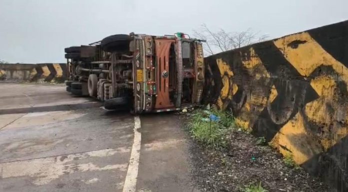 प्राथमिक माहितीनुसार, कंटेनर उतारावर असताना ब्रेक फेल झाल्यामुळे ते अनियंत्रित झाले आणि थेट रस्त्यावर उलटला.