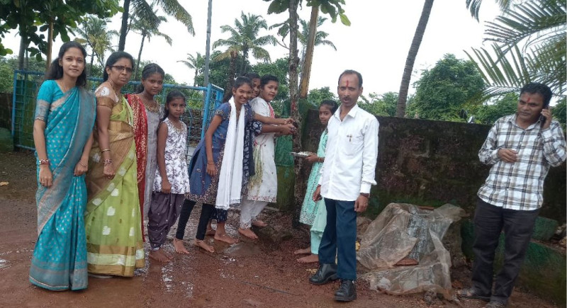 फोटो = जि.प.पूर्ण प्राथमिक आदर्श मराठी शाळा मेर्वी शाळेच्या वतीने वृक्षांना राखी बांधून वृक्षसंवर्धनाचा संदेश दिला आहे याप्रसंगी मुख्याध्यापिका सौ.शर्वरी करगुटकर उपशिक्षक श्री.चंद्रशेखर पेटकर आणि शिक्षकवृंद