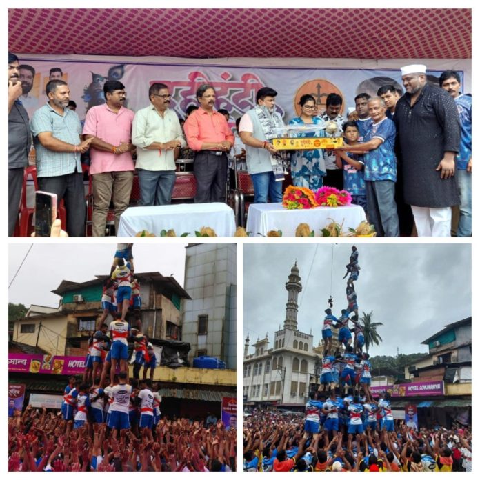 राजापूर (वार्ताहर): शहर आणि तालुका परिसरात शनिवारी पारंपारिक पध्दतीने दहीकाला उत्सव साजरा करण्यात आला. सायंकाळी जवाहरचौक येथे शिवसेना राजापूर शहर प्रमुख सौरभ खडपे आयोजित व आमदार किरण सामंत पुरस्कृत सलग चौथ्या वर्षी आयोजित करण्यात आलेल्या दहीहंडी उत्सवात शहर आणि तालुक्यातील विविध गोविंदा पथकांनी भाग घेत उत्सवाची रंगत वाढवली. या उत्सवाला राज्याचे उद्योग व मराठी भाषा मंत्री तथा रत्नागिरीजे पालकमंत्री ना. उदय सामंत यांनी भेट दिली. ही दहीहंडी पाहण्यासाठी शहर आणि तालुका परिसरातून नागरिकांनी मोठी गर्दी केली होती. यातील सहभागी पाच गोविंदा पथकांनी सात मानवी मनोरे रचत दहीहंडीला सलामी देत उपस्थित रसिकांची मने जिंकली. या सर्व पथकांना रोख रक्कम व चषक देऊन गौरविण्यात आले.