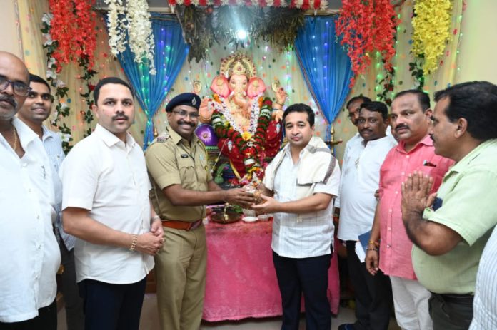 वेंगुर्ले l दाजी नाईक :वेंगुर्ले पोलीस ठाण्यात पोलिसांच्या वतीने प्रतिष्ठापना करण्यात आलेल्या गणपतीचे पालकमंत्री नितेश राणे यांनी शुक्रवारी सायंकाळी दर्शन घेतले. तर १७ दिवसांच्या या गणरायाचे रात्री पोलीस अधिकारी, कर्मचारी आणि त्यांच्या कुटुंबीयांनी मिरवणुकीने मांडवी खाडी येथे गणरायाचे विसर्जन केले.