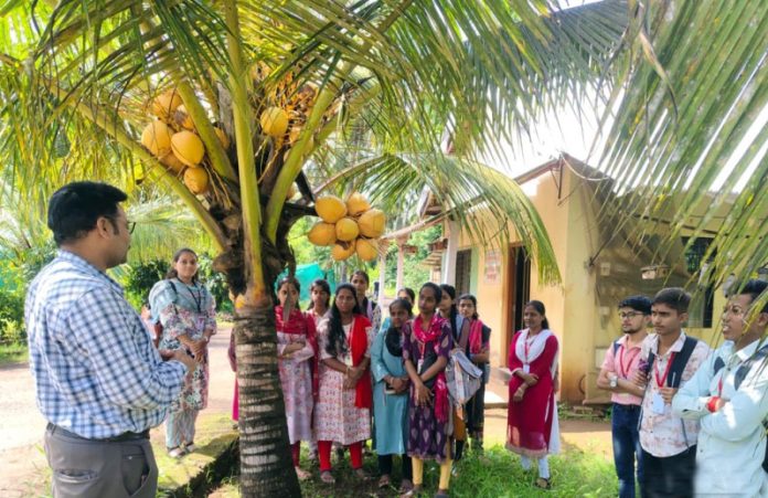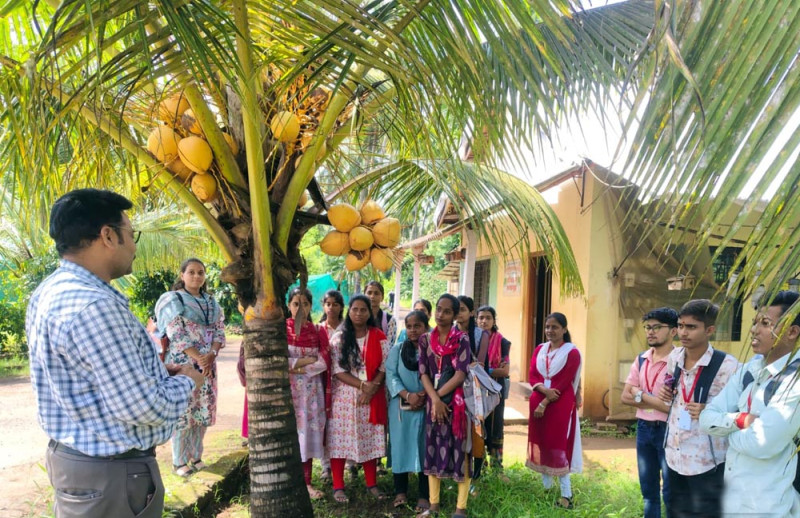 केंद्राचे वरिष्ठ कीटकशास्त्रज्ञ डॉ. संतोष वानखेडे यांनी नारळाच्या विविध जाती, रोग आणि कीड व्यवस्थापन, नवीन संशोधन पद्धतींची माहिती दिली. डॉ. वानखेडे यांनी नारळ उत्पादनात वाढ करण्यासाठी अवलंबण्यात येणाऱ्या पद्धतींची माहिती दिली. नारळाच्या झाडांची काळजी कशी घ्यावी, खत व्यवस्थापन आणि पाणी व्यवस्थापनाचे महत्त्व सांगितले. नारळासोबतच दालचिनी, जायफळ, काळी मिरी, रातांबा, केळी, अननस इत्यादी मसाल्याच्या आणि फळ पिकांची माहिती दिली. या केंद्रात नारळ, मसाला पिके आणि फळ पिकावरील संशोधनाच्या आधारावर लाखी बाग ही संकल्पना विकसित करण्यात आली आहे. ज्यामध्ये एक एकर जागेत नारळा सोबतच मसाला पिके व फळ पिके यांची सेंद्रिय पद्धतीने एकत्रित लागवड केली जाते. यामुळे कमी जागेत अधिक उत्पन्न मिळवून देणारी ही एक प्रभावी पद्धत विद्यार्थ्यांना अवगत झाली. क्षेत्रभेटीस महाविद्यालयातील अर्थशास्त्र विभागप्रमुख प्रा. स्मार्था कीर आणि प्रा. वैभव कीर उपस्थित होते.