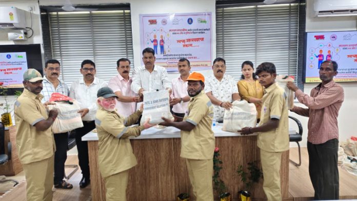 मालवण | प्रतिनिधी : मालवण शहारातील घनकचरा व्यवस्थापनासाठी आमदार निलेश राणे यांच्या पाठपुराव्यातून १ कोटी ९८ लाख रुपयांचा निधी मंजूर झाला आहे. दरम्यान, मालवण नगरपालिका कचरा संकलन व शहर स्वच्छतेसाठी काम करणाऱ्या सर्व कंत्राटी सफाई कर्मचाऱ्यांच्या सुरक्षेच्या दृष्टीने पर्सनल प्रोटेक्टीव इक्विपमेंट युनिफॉर्म (पीपीई किट व साहित्य) शिवसेना जिल्हा प्रमुख दत्ता सामंत यांच्या प्रमुख उपस्थितीत वितरीत करण्यात आले.