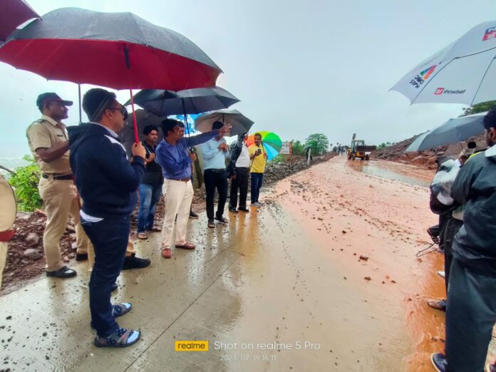 या पार्श्वभूमीवर मुंबई गोवा राष्ट्रीय महामार्गावरील परशुराम घाटामध्ये अतिवृष्टीमुळे दरड कोसळलेल्या ठिकाणाची पाहणी जिल्हाधिकारी श्री एम देवेंद्र सिंह यांनी केली. व संबंधित यंत्रणेला आवश्यक ती दक्षता घेण्याच्या सूचना दिल्या.