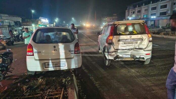 खेड (प्रतिनिधी) – मुंबई–गोवा महामार्गावरील भरणे नाका येथे शुक्रवारी रात्री सुमारे ९.१५ वाजण्याच्या सुमारास भीषण अपघात घडला. महामार्गावर उभ्या असलेल्या मारुती वॅगन आर कारला पाठीमागून आलेल्या अल्टो कारने जोरदार धडक दिली. ही धडक इतकी तीव्र होती की वॅगन आर कार काही मीटर पुढे फरफटत गेली, तर अल्टो कार महामार्गालगत असलेल्या दुभाजकावर चढली.