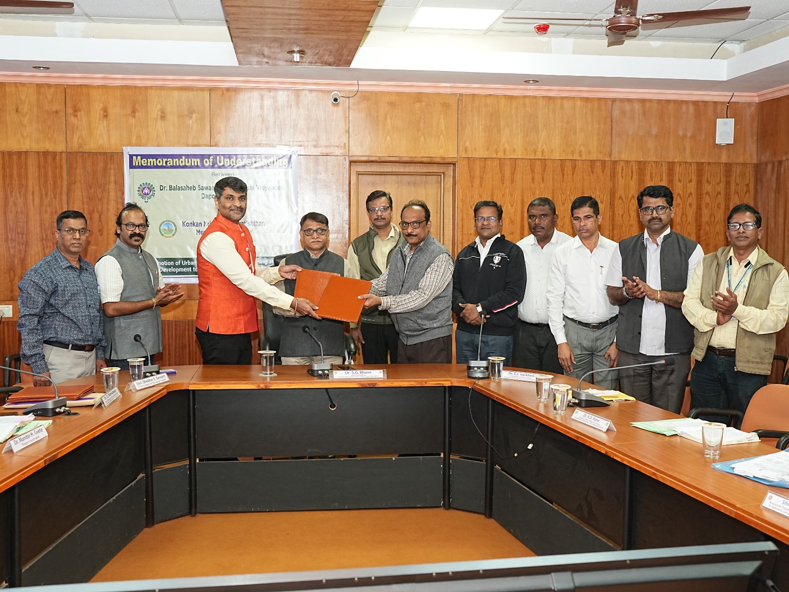 दापोली : शहरी शेती आणि नैसर्गिक शेतीच्या क्षेत्रात विस्तार, प्रशिक्षण, क्षमता बांधणी व संशोधन कार्य अधिक बळकट करण्यासाठी डॉ. बाळासाहेब सावंत कोकण कृषी विद्यापीठ (DBSKKV), दापोली आणि कोकण कृषी विकास प्रतिष्ठान (KKVP), मुंबई यांच्यात नुकताच सामंजस्य करार (MoU) करण्यात आला. विद्यापीठाच्या दापोली येथील परिसरात कुलगुरू डॉ. संजय भावे यांच्या प्रमुख उपस्थितीत हा करार संपन्न झाला. यावेळी विद्यापीठाचे शिक्षण संचालक डॉ. नरखेडे, प्रतिष्ठानचे व्यवस्थापकीय विश्वस्त श्री. शेखर सावंत, कार्यक्रम समन्वयक डॉ. मंदार गीते यांच्यासह विद्यापीठातील विविध विभागांचे प्रमुख शास्त्रज्ञ आणि ज्येष्ठ प्राध्यापक उपस्थित होते.