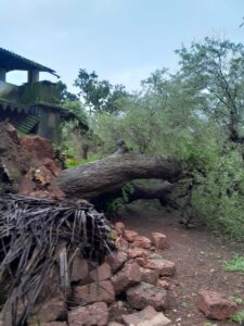 मळगांव गोसावीवाडी येथील विठ्ठल मंदिर लगत असलेल्या धर्मशाळेवर लगत असलेला प्राचीन पिंपळ वृक्ष कोसळल्याने मोठे नुकसान झाले. तर बाजूलाच असलेल्या विद्युत वाहिन्यावर देखील झाडाचा काही भाग पडल्यामुळे विजेचे खांब तुटले. त्यामुळे दिवसभर या भागातील विद्युत पुरवठा खंडित करण्यात आला होता. तर रात्री उशिरापर्यंत दुरुस्तीचे काम सुरू होते. तालुक्यात अनेक ठिकाणी अशा घटना घडत असल्यामुळे खाजगी ठेकेदारांकरवी महावितरण कडून कामे करून घेतली जात असली तरीही पुरेसा कर्मचारी वर्ग उपलब्ध नसल्यामुळे ही कामे पूर्ण करण्यात अडथळा येत असल्याचे निदर्शनास आले आहे. याबाबत स्थानिक ग्राहकांनी तीव्र नाराजी व्यक्त केली असून आपत्तीच्या काळात महावितरणने कर्मचारी वाढवावेत अशी मागणीही स्थानिकांनी केली आहे.