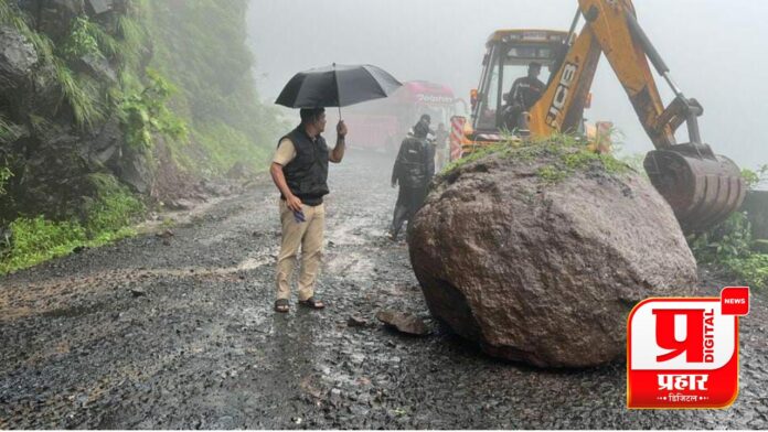 तालुक्यात शुक्रवारी पावसाचा जोर काहीसा ओसरला होता. परंतु शनिवारी मध्यराञीपासून पावसाचा जोर पुन्हा वाढला असून दिवसभर पावसाची जोरदार बॕटींग सुरु होती. सह्याद्रीपरिसरात होणाऱ्या अतिवृष्टीमुळे करुळ घाटात गगनबावड्यापासून २ कि.मी. अंतरावर भला मोठा दगड रस्त्यावर आला. दगड रस्त्यावर मधोमध असल्यामुळे वाहातूक विस्कळीत झाली होती. पोलिसांना माहीती मिळताच पोलिस हवालदार राहुल पवार, रमेश नारणवर यांनी घटनास्थळी धाव घेतली. त्यांनी जेसीबी बोलावून रस्त्यावरचा दगड बाजूला करुन वाहातूक सुरळीत केली. नदीनाले दुथडी भरुन वाहत आहेत. तर अनेक छोटे काॕजवे व मो-यां पाण्याखाली गेल्या आहेत. त्यामुळे ग्रामस्थांची गैरसोय होत आहे.