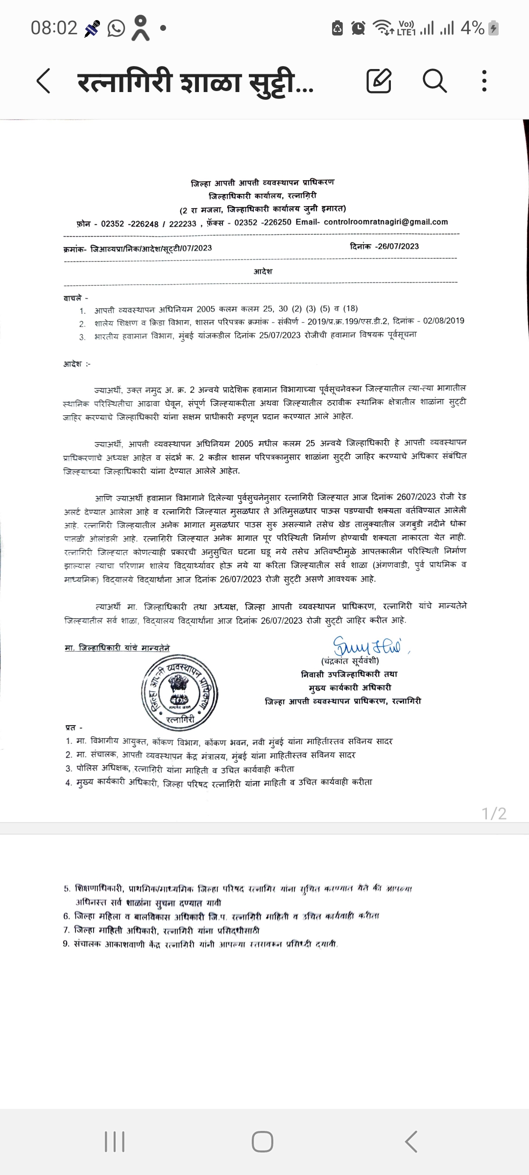 महत्वाच्या बातम्यारत्नागिरी रत्नागिरी : शाळांना आज सुट्टी; जिल्हाधिकारी यांचे आले आदेश July 26, 2023 Share WhatsAppFacebookTwitterTelegram