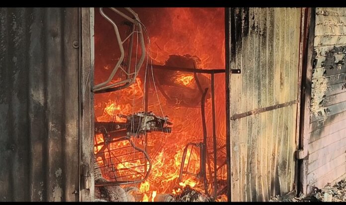 आज सकाळी साडे आठच्या सुमारास सुरेश गायकवाड यांनी गाळ्यालगत पडलेला कचरा व ऑईल मध्ये खराब झालेली कापडे एकत्र करून जाळत असताना ऑईलच्या कापडामुळे आग गॅरेजमध्ये शिरली बघेपर्यंत आगीने रौद्र रूप धारण केले तर आतमध्ये असणारी सुरेश गायकवाड यांच्या मालकीची दुचाकी दुरुस्तीसाठी काल दिली होती ती जळून खाक झाली तर ऑईल डब्बे, इतर साहित्य जळून खाक झाले. यामध्ये एक दुचाकी, इतर साहित्य, ऑईल कॅन, इतर गाड्याचे स्पेअर स्पार्ट असे मिळून दोन लाख रुपयांचे नुकसान झाले आहे तर जेन्टस पार्लर मधील सर्व फर्निचर व इतर साहित्य जळून खाक झाले. असून फक्त पत्रेच शिल्लक राहिले आहेत.