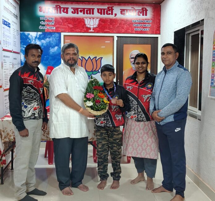 पदक विजेता प्रद्युम्न व प्रशिक्षक यांचे भाजपा मा. उत्तर रत्नागिरी जिल्हाध्यक्ष श्री. केदारजी साठे, भाजपा उत्तर रत्नागिरी जिल्हा उपाध्यक्ष तसेच जालगाव पंचायत समिती सदस्य श्रीराम इदाते, आणि भाजपा महिला मोर्चा तालुकाध्यक्ष सौ.जया साळवी, भाजपा महिला मोर्चा शहराध्यक्ष सौ. वैष्णवी वेल्हाळ, श्री.प्रदिप दाभोळे,श्री. विष्णू गोडसे, सौ. अक्षता दरेकर तसेच सिध्दाई तायक्वाँडो स्पोर्ट्स अँन्ड फिटनेस अकॅडमी, दापोली सहसचिव श्री. महेश्वर जाधव, कोषाध्यक्षा सौ. श्रध्दा दाभोळे , सदस्य श्री. शैलेश मिसाळ व श्री. मंगेश गोडसे आणि समस्त पालक वर्ग यांनी अभिनंदन करून पुढील वाटचालीसाठी शुभेच्छा दिल्या