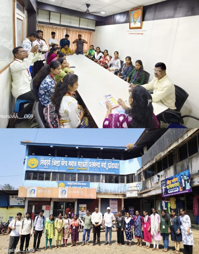फोंडाघाट: कुमार नाडकर्णी — येथील कला आणि वाणिज्य महाविद्यालय, फोंडाघाटच्या अर्थशास्त्र विभागातील विद्यार्थ्यांनी सिंधुदुर्ग जिल्हा वैश्य समाज सहकारी पतसंस्था मर्या., फोंडाघाट प्रधान कार्यालयास शैक्षणिक भेट देऊन सहकार क्षेत्रातील कार्यपद्धतीची प्रत्यक्ष माहिती घेतली.अर्थशास्त्र विभाग प्रमुख डॉ. बालाजी सुरवसे यांनी सांगितले की, या शैक्षणिक भेटीचा मुख्य उद्देश अर्थशास्त्र विषयातील सहकार, वित्तीय संस्था व स्थानिक अर्थव्यवस्था या घटकांचा विद्यार्थ्यांना प्रत्यक्ष अनुभव मिळावा तसेच पतसंस्थांची कार्यपद्धती विद्यार्थ्यांना समजावी हा आहे.