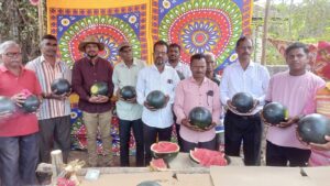 कलिंगड तोडणीचा मुहूर्त करताना हडी सरपंच प्रकाश तोंडवळकर, हडी ज्येष्ठ नागरिक संघाचे मार्गदर्शक चंद्रकांत पाटकर, ज्येष्ठ ग्रामस्थ विजय सुर्वे आणि शेतकरी उपस्थित होते.शेतीमध्ये नवनवीन प्रयोग करण्यासाठी उत्साह आणि योग्य नियोजनाची गरज असते. हेच ओळखून हडी येथील जेष्ठ नागरिक सुर्वे आणि इतर चार जणांच्या अनुभवी हातांनी यंदा कलिंगड शेतीचा यशस्वी प्रयोग राबवला आहे. पारंपरिक शेतीला फाटा देत, वयाच्या या टप्प्यावर त्यांनी आधुनिक तंत्रज्ञानाची जोड देऊन कलिंगडाचे जे भरघोस उत्पन्न मिळवले आहे, ते पाहता ‘नियोजन असेल तर शेती हा नक्कीच नफ्याचा व्यवसाय आहे’ हे त्यांनी समाजाला दाखवून दिले आहे.