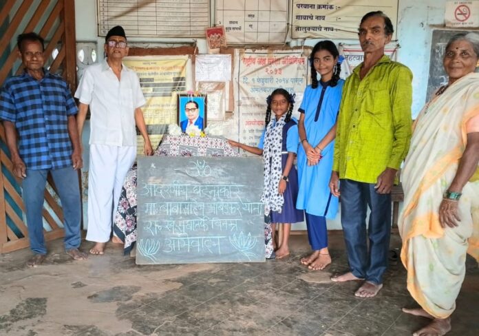 यावेळी दिलीप जोशी यांच्या सह ग्रामस्थ व शाळकरी मुले उपस्थित होती.दिलीप जोशी यांनी डॉ.बाबासाहेब आंबेडकर यांच्या अद्वितीय कार्याचा आढावा घेत,त्यांच्या स्मृतीस आदरांजली अर्पण करण्यात आली.यावेळी राष्ट्रीय स्वयंसेवक संघातर्फे देखील विनम्र अभिवादन करण्यात आले.