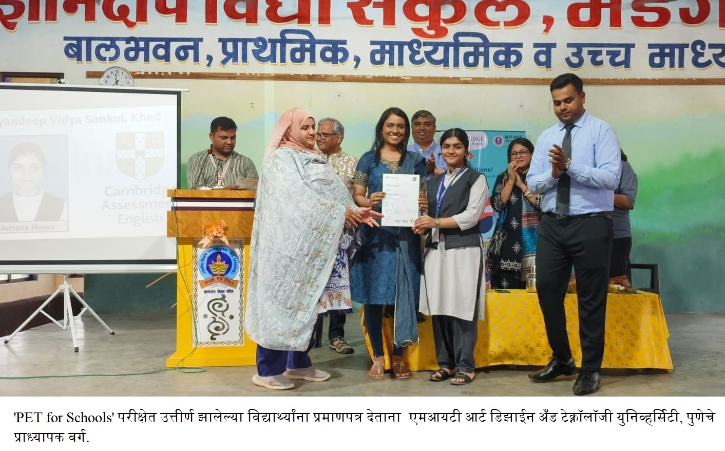 कार्यक्रमादरम्यान डिसेंबर २०२५ मध्ये घेण्यात आलेल्या ‘PET for Schools’ परीक्षेत उत्तीर्ण झालेल्या विद्यार्थ्यांचा प्रमाणपत्र देऊन विशेष गौरव करण्यात आला. या सन्मानामुळे विद्यार्थ्यांमध्ये आत्मविश्वास वाढला असून भविष्यात अधिक प्रगती करण्याची प्रेरणा मिळाली.