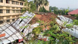 शहरातील मोक्याच्या ठिकाणी असलेल्या रामेश्वर प्लाझा इमारतीचे पत्र्याचे छत उडून थेट एस.पी. कॉलेज परिसरात कोसळले. याशिवाय इमारतीच्या काचेच्या खिडक्या फुटून मोठे आर्थिक नुकसान झाले आहे. विशेष म्हणजे, सावंतवाडी नगरपरिषदेने नुकतीच शहरातील जुन्या पत्र्यांच्या शेडचे स्ट्रक्चरल ऑडिट करण्याच्या सूचना दिल्या होत्या. ही सूचना दिलेली असतानाच ही घटना घडल्याने शहरात चर्चा सुरू आहे. हे छत जर मोती तलावाच्या मुख्य रस्त्याकडे कोसळले असते, तर मध्यरात्रीही मोठी दुर्घटना घडली असती.