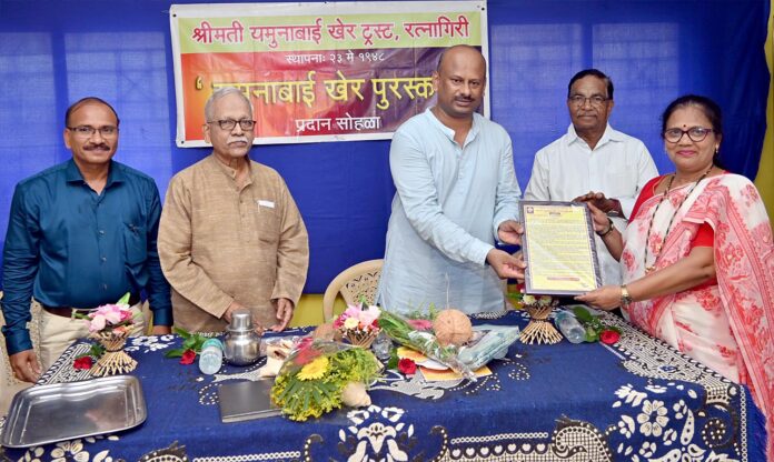 रत्नागिरी : श्रीमती यमुनाबाई खेर ट्रस्टचा यमुनाबाई खेर सर्वोदय पुरस्कार सामाजिक कार्यकर्त्या श्रीमती शुभांगी कोलगे–बेलवलकर यांना विधी सेवा प्राधिकरणाचे सचिव, न्यायाधीश राजेंद्र पाटील यांच्या हस्ते करण्यात आला. साडी, सन्मानचिन्ह, श्रीफळ आणि रोख रक्कम असे पुरस्काराचे स्वरूप होते. सर्वोदय छात्रालयातील मोरोपंत जोशी सभागृहात रविवारी कार्यक्रम झाला.