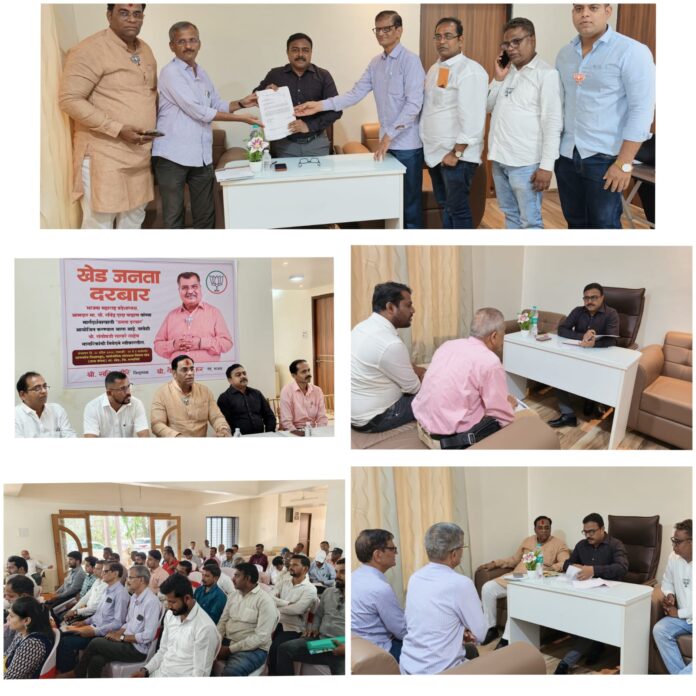 खेड (प्रतिनिधी) – खेड येथील शासकीय विश्रामगृहात भाजपा प्रदेशाध्यक्ष तथा आमदार सन्मा. श्री. रवींद्र चव्हाण यांचे ओएसडी श्री. संतोष साखरे यांच्या मार्गदर्शनाखाली मंगळवार दि 28 एप्रिल रोजी जनता दरबार उत्साहात संपन्न झाला. या उपक्रमातून खेड तालुक्यातील सर्वसामान्य नागरिकांच्या समस्या, अडचणी आणि मागण्यांना योग्य व्यासपीठ उपलब्ध करून देण्याचा प्रयत्न करण्यात आला.