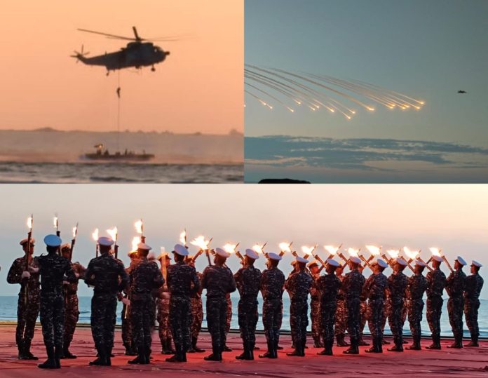 सायंकाळीं पाच वाजता नौदलाचे मरीन कमांडो आकाशात पॅराशुट मधून खाली उतरत नौदलाच्या सरावाला सुरुवात झाली. निश्चित केलेल्या पॉइंट वर एका मागोमाग एक असे भारताच तिरंगा आणि नौदलाचा ध्वज फडकवत पॅराशुट द्वारे कमांडो खाली जमिनीवर उतरले. या नंतर आकाशात तेजस, डॉर्निअर, मिग २९ के आदी एअरक्राफ्टनी आपल्या कसरती दाखविल्या. तारकर्लीच्या आकाशात लडाऊ विमानांनी कसरती चालू झाल्या नंतर त्यांच्या आवाजाने आसमंत दणाणला.