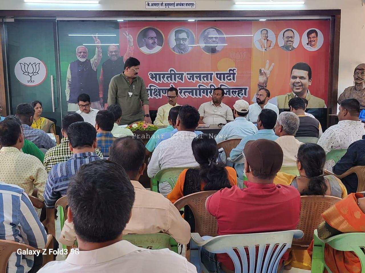 रत्नागिरी-संगमेश्वर विधानसभा क्षेत्र प्रमुख बाळासाहेब माने यांनी येणाऱ्या लोकसभा निवडणुकीत विजयी होण्यासाठी ‘अपना बूथ सबसे मजबूत ‘ प्रमाणे प्रत्येक बूथ वर ५१% च्या पुढे मत मिळाली पाहिजेत व राहिलेल्या १०० दिवसात सगळ्यांनी या साठी प्रयत्न करायचे आहेत असे सांगत भाजपा कार्यकर्त्यांना कानमंत्र दिला. सर्वत्र मतदारसंघामध्ये कशापद्धतीने काम करायचे आहे आणि जास्तीत जास्त लोकांपर्यंत पोहोचू पंतप्रधान नरेंद्रजी मोदी यांच्या योजना आणि कार्य लोकांपर्यंत पोहोचवायचे आहे हे कार्यकर्त्यांना मार्गदर्शन तालुकाअध्यक्ष विवेक सुर्वे यांनी केले. या बैठकीस भारतीय जनता पार्टी जिल्हाध्यक्ष राजेश सावंत, विधानसभा क्षेत्रप्रमुख बाळासाहेब माने तालुकाध्यक्ष विवेक सर्वे यांच्यासह जिल्हा व तालुका पदाधिकारी मोठ्या संख्येने उपस्थित होते.