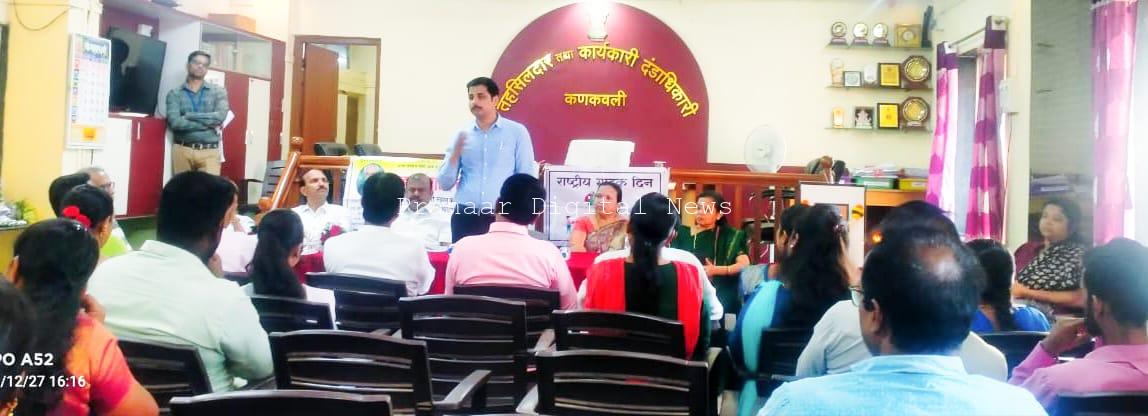 कणकवली : ग्राहक दिनानिमित्त आयोजित निबंध स्पर्धेच्या बक्षीस वितरण कार्यक्रम ग्राहक संरक्षण महाराष्ट्र कणकवली यांच्यावतीने कणकवली तहसीलदार कार्यालयात आयोजित करण्यात आला होता. यावेळी नायब तहसीलदार प्रिया हर्णे-परब, व्यापारी संघ अध्यक्ष दीपक बेलवलकर, प्रवासी संघटना अध्यक्ष मनोहर पालयेकर, जेष्ठ नागरिक दादा कुडतरकर, अशोक करंबळेकर, ग्रामपंचायत कणकवलीच्या अध्यक्षा श्रद्धा कदम, उपाध्यक्षा गीतांजली कामत, मंडळ अधिकारी दिलीप पाटील, अमोल खानोलकर आदींसह महसूलचे पदाधिकारी, कर्मचारी उपस्थित होते.