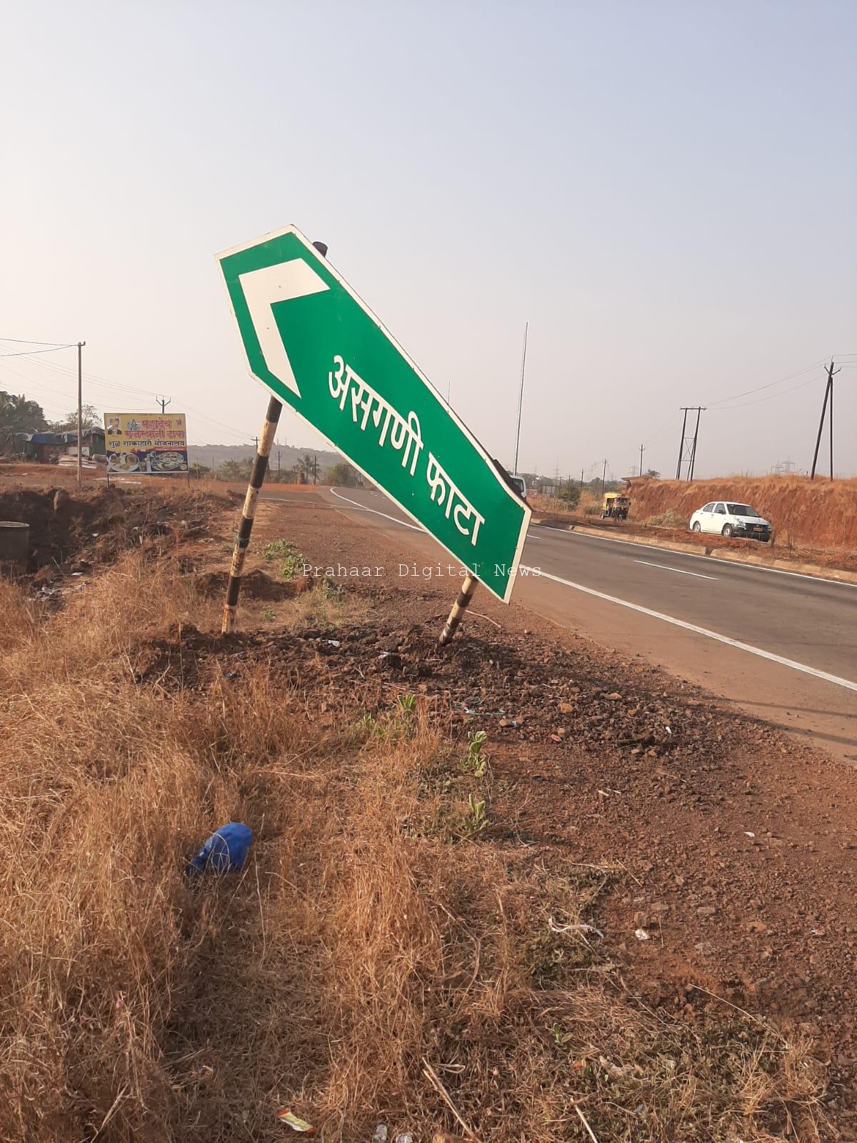 मुंबई-गोवा राष्ट्रीय महामार्गाचे चौपदरीकरणाचे खेड तालुक्यातील काम अजून अर्धवट स्थितीत आहे. या कामादरम्यान मार्गावर गावात जाण्यासाठी उभारण्यात आलेले दिशादर्शक फलक कोलमडून पडले आहेत.