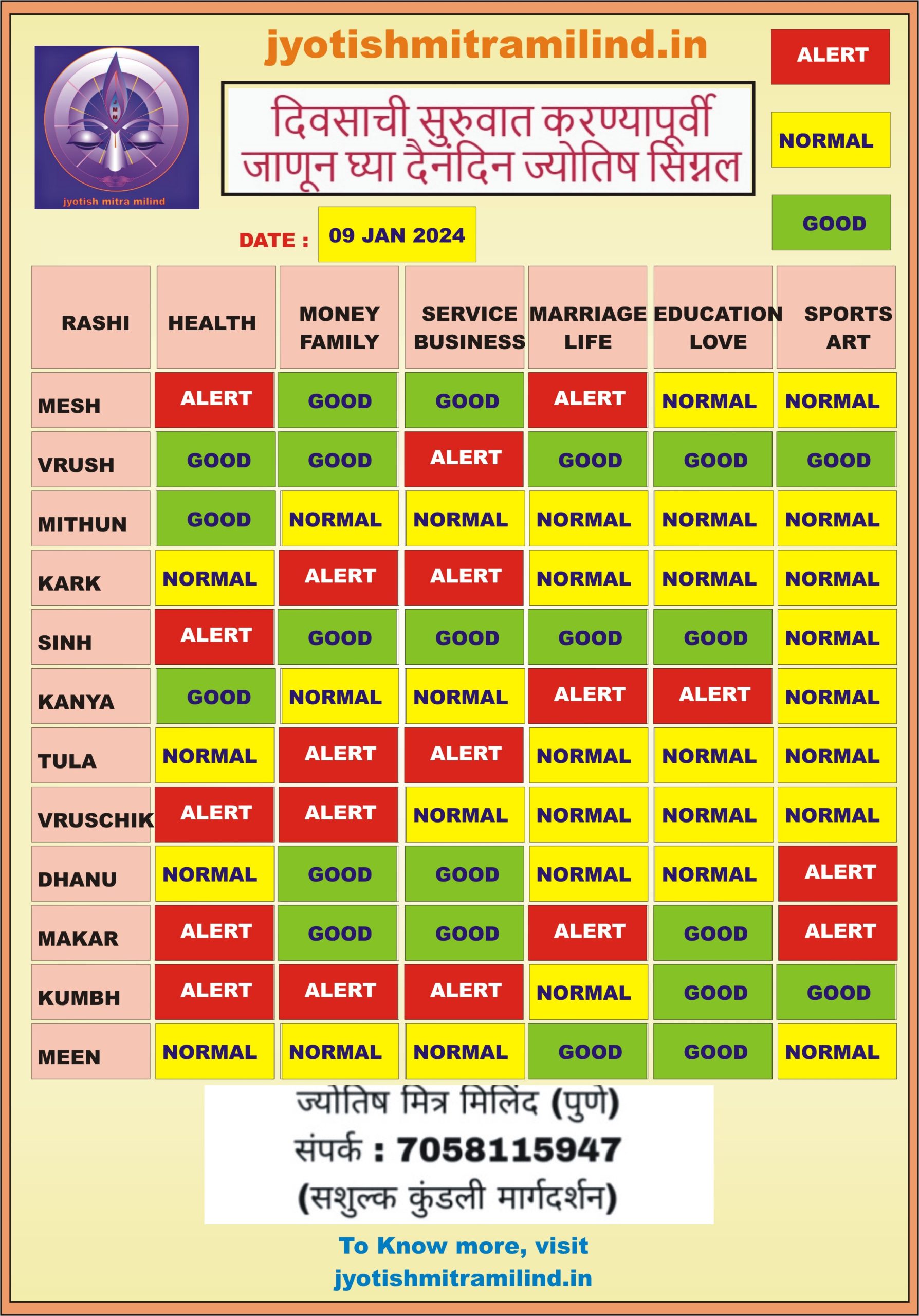 ताज्या घडामोडीराशी भविष्य आजचे राशिभविष्य | दैनंदिन तक्ता January 9, 2024 Share WhatsAppFacebookTwitterTelegram logo आजचे राशिभविष्य | दैनंदिन तक्ता