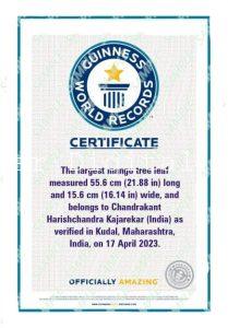 स्वप्निल कदम l कुडाळ : सिंधुदुर्ग जिल्ह्यातील शेती व बागायतदार श्री चंद्रकांत हरिश्चंद्र काजरेकर कुडाळ यांच्या हापूस आंब्याच्या झाडावर आलेले पान जगातील सर्वात मोठे हापूस आंब्याच्या झाडाचे पान म्हणून रेकॉर्ड झाले आहे. कुडाळ चे सुपुत्र चंद्रकांत हरिश्चंद्र काजरेकर जगातील रेकॉर्ड होल्डर ठरले आहेत.
