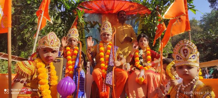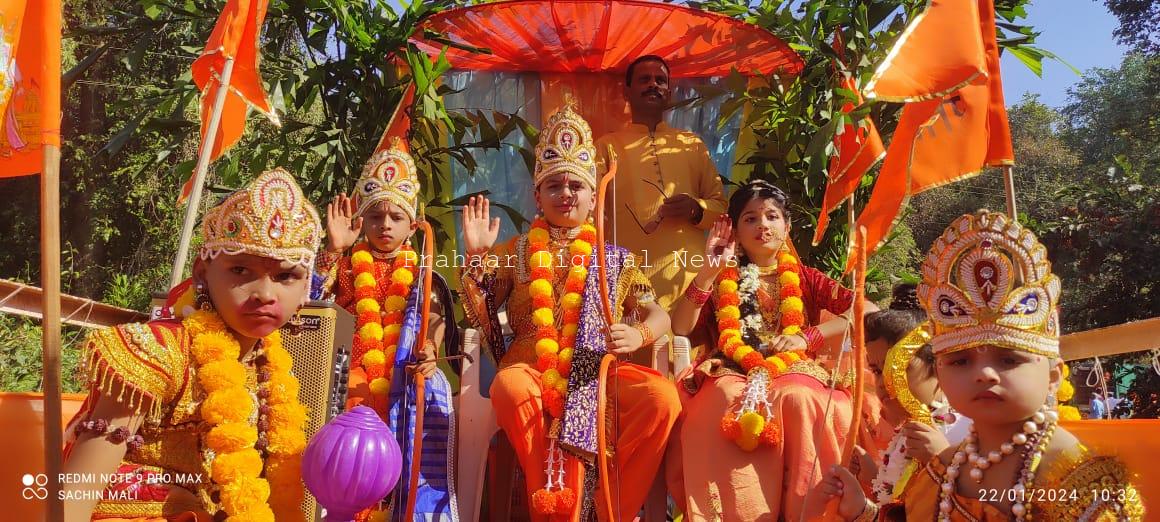 मंडणगड :अयोध्येतील श्रीराम मंदिरात होणाऱ्या राम मूर्ती प्रतिष्ठापणेच्या पार्श्वभूमीवर मंडणगड शहरात ढोलताशांच्या गजरात हा उत्सव साजरा करण्यात आला. यानिमित्ताने काढण्यात आलेल्या शोभायात्रेत राम, सीता लक्ष्मण, हनुमान यांच्या वेशभूषा परिधान केलेल्या छोट्या रामक्तांमुळे प्रत्यक्षात आपले दैवत अवतरल्याचा भास शहर वासीयांना झाला. जय श्रीरामच्या जयघोषाने संपूर्ण शहर दुमदुमले.