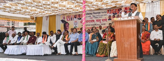 सावंतवाडी येथे आयोजित महायुतीच्या जाहीर सभेत उपस्थितांना संबोधित करताना केंद्रीय मंत्री नारायण राणे कोकणी जनतेला साद दिली. यावेळी राज्याचे शालेय शिक्षणमंत्री ना. दीपक केसरकर, आमदार नितेश राणे, आमदार निरंजन डावखरे, शिक्षक पदवीधर मतदारसंघाचे आमदार ज्ञानेश्वर म्हात्रे, माजी आमदार राजन तेली, शिवसेना जिल्हाप्रमुख अशोक दळवी,भाजपचे जिल्हा उपाध्यक्ष तथा माजी नगराध्यक्ष संजू परब, राष्ट्रवादीचे सरचिटणीस काका कुडाळकर, भाजप महिला जिल्हाध्यक्षा श्वेता कोरगावकर, शिवसेना महिला जिल्हाप्रमुख ॲड. नीता कविटकर, मनसेचे जिल्हाध्यक्ष ॲड. अनिल केसरकर, माजी उपनगराध्यक्ष राजन पोकळे, सचिन वालावलकर, शिवसेना बबन राणे, विधान सभा मतदार संघ प्रेमानंद देसाई, वेंगुर्ले तालुका प्रमुख नितीन मांजरेकर, रुपेश पावसकर, अशोक पवार, रमाकांत जाधव, अनारोजीन लोबो, गणेशप्रसाद गवस आदींसह महायुतीचे पदाधिकारी कार्यकर्ते उपस्थित होते.
