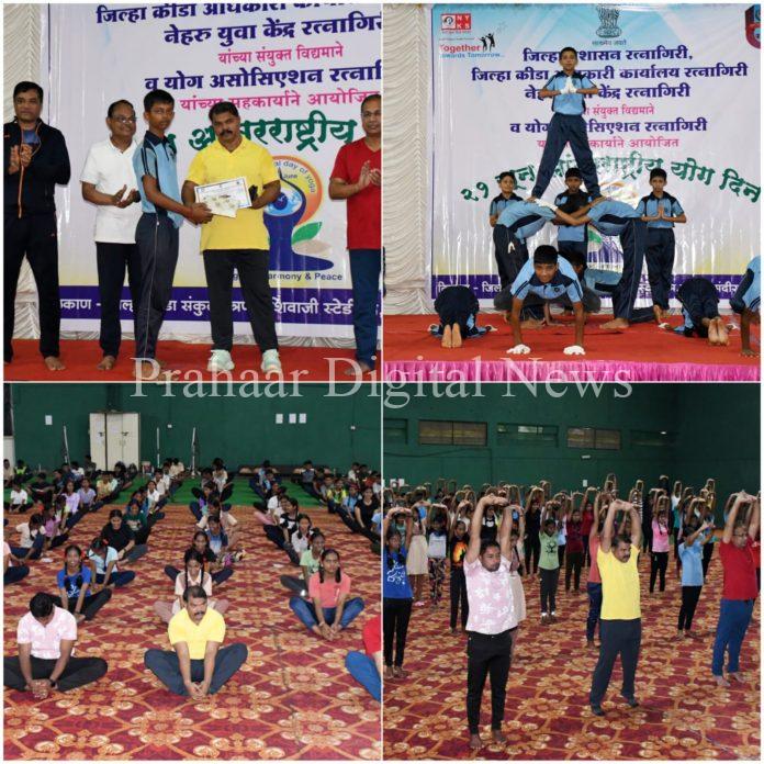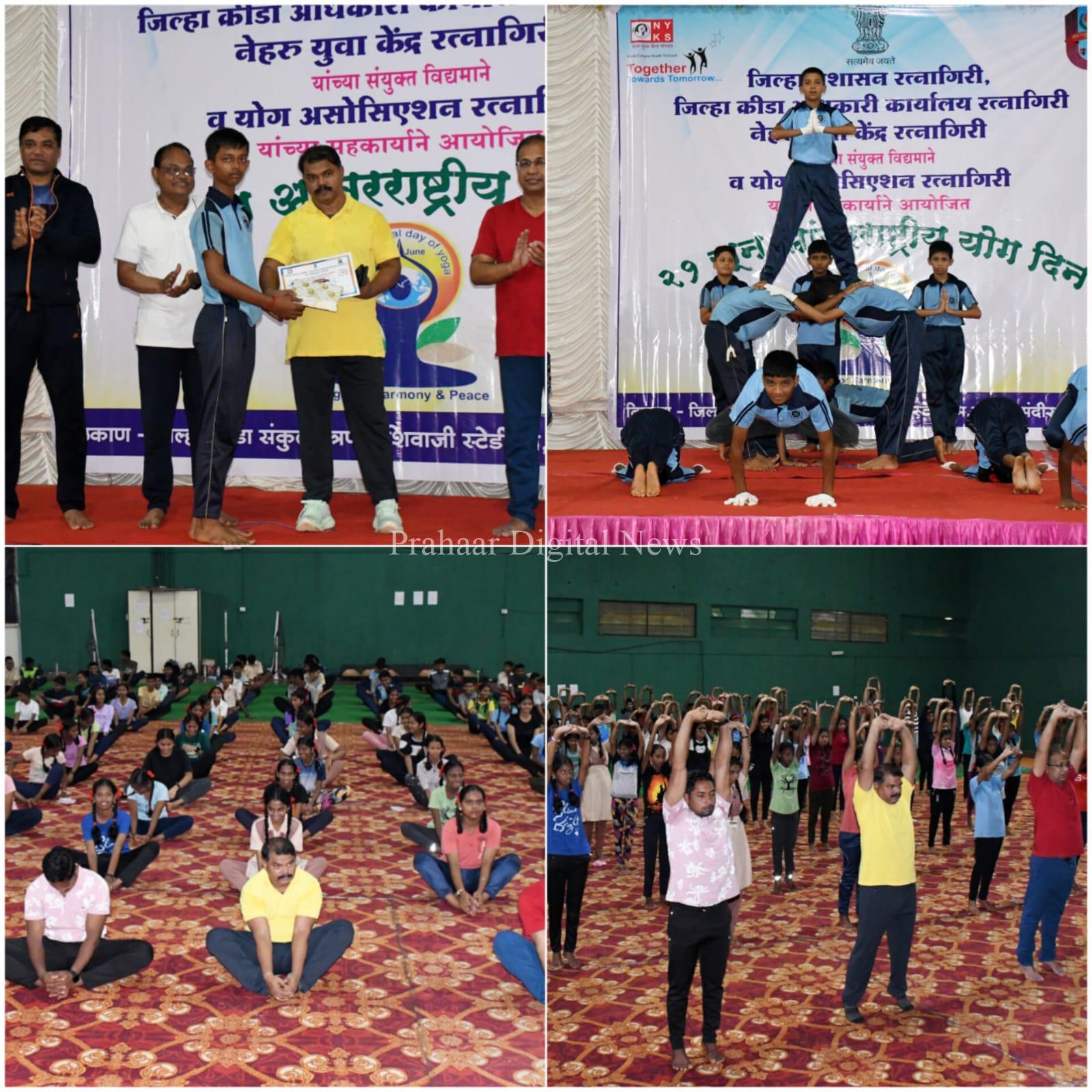 जिल्हा प्रशासन, जिल्हा क्रीडा अधिकारी कार्यालय, नेहरु युवा केंद्र यांच्या संयुक्त विद्यमाने आणि योग असोसिएशन यांच्या सहकार्याने येथील जिल्हा क्रीडा संकुलात आंतरराष्ट्रीय योग दिन आज झाला. याप्रसंगी उपजिल्हा निवडणूक अधिकारी राहुल गायकवाड, जिल्हा पुनर्वसन अधिकारी मारुती बोरकर, अन्न व औषध प्रशासनाचे सहाय्यक आयुक्त दीनानाथ शिंदे, तहसिलदार राजाराम म्हात्रे, जिल्हा सांख्यिकी उपसंचालक निवास यादव, स्काऊट गाईड संघटक रमाकांत डिंगणे आदी उपस्थित होते.