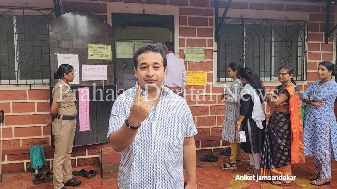 आमदार नितेश राणे यांनी रांगेत उभे राहत बजावला मतदानाचा हक्क